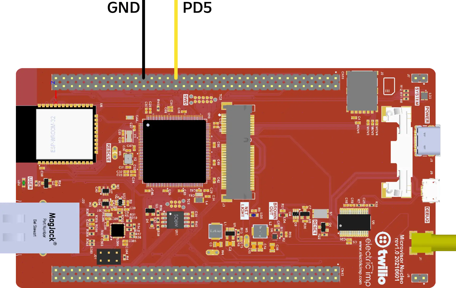 Connect your FTDI cable to one of your computer’s USB ports, and its RX wire (usually colored yellow) to PD5, which is pin 41 of block CN11 on the NDB. This is the GPIO header alongside the SIM card slot. Connect the FTDI’s GND wire to pin 49 of CN11.